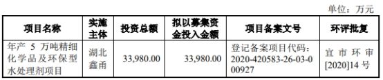 鑫甬生物原拟公开发行股票数量不超过2,625万股,全部为新股发行,新股发行数量占发行后公司总股本的比例不低于25%;鑫甬生物原拟募集资金3.40亿元,用于年产5万吨精细化学品及环保型水处理剂项目。?