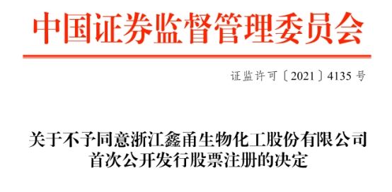 中国经济网北京5月25日讯?深交所网站昨日公布关于不予浙江鑫甬生物化工股份有限公司(以下简称“鑫甬生物”)首次公开发行股票注册的批复。?